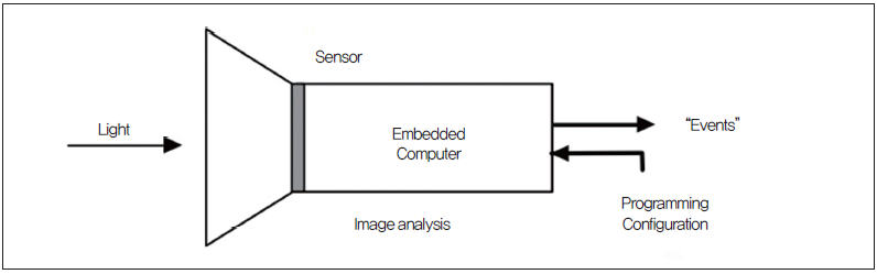 스마트 카메라와 다른 카메라를 구분하는 가장 정확한 방법은 카메라에 내장된 프로세서가 어떤 작업을수행하며, 스마트카메라의 출력이 어떤 값을 가지는가를 기준으로 구별해야 한다. 따라서 이러한 기준을 기반으로 스마트 카메라를 정의하면, (그림 2)와같이, 입력되는 이미지로부터 특정한 이벤트를 검출하거나, 지능형 시스템이나 자동화 시스템에서 사용할 수 있는 의사결정 정보의 생성 또는 애플리케이션에 적용할 수 있는 정보를 추출할 수 있는 ‘임베디드 비전시스템’으로 정의 할 수 있다.