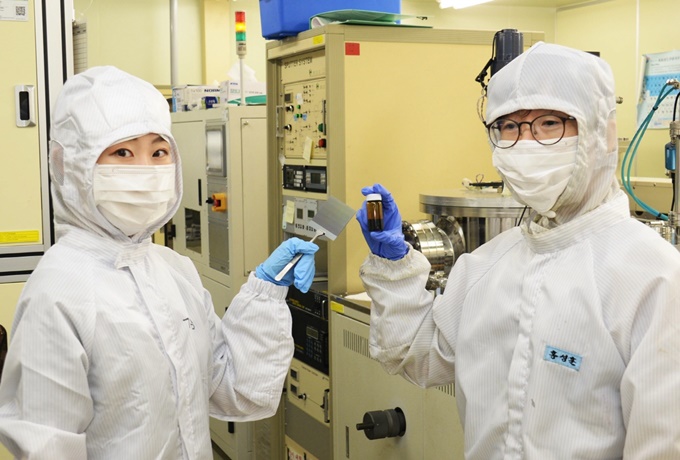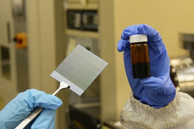 ▲ETRI 연구진이 실험에 사용한 기판과 용액(잉크)을 보이고 있는 모습