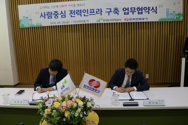 한국전력(대표이사 사장 김종갑)은 지난 9월 28일 한국토지주택공사(LH)와 사람중심의 친환경 전력인프라 구축사업을 위한 업무협약(MOU)을 체결했다.