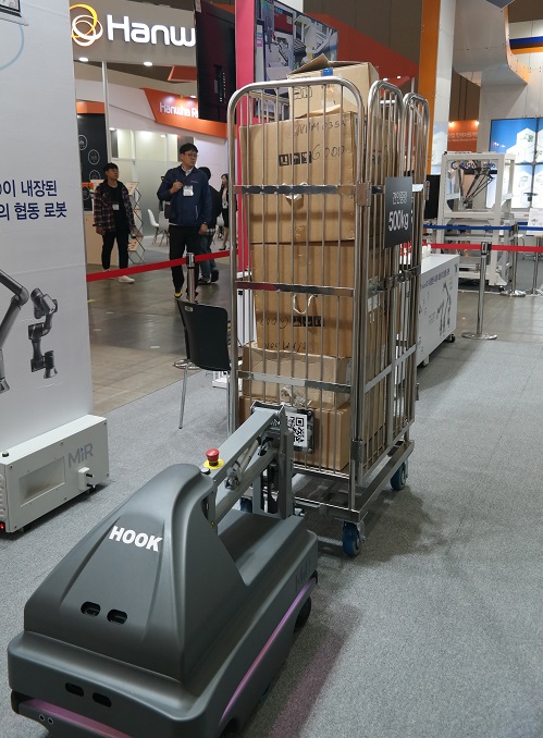 물류이송 로봇 ‘MiR’은 기존 AGV와 달리 마그네틱 없이도 주행이 가능하며, 레이저 스캐너 및 3D 카메라를 통해 주변 경로 및 상황을 파악해 주행할 수 있다. 사람, 장애물 등을 감지해 운전할 수 있기 때문에, 근무자들이 더욱 안전하고 편리하게 작업이 가능하다. 최대 500kg 중량물 및 팔레트를 이송할 수 있으며, 시간당 7.2km 운행이 가능하다.