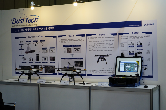 이번 전시회에서 두시텍은 자사의 기술력이 발휘된 kn시리즈 드론을 선보였다. 두시텍은 공간정보 빅데이터 구축을 위한 드론 플랫폼을 소개하면서 자동정보 공간정보 빅데이터 획득용 소형 무인기 양산 제품, 2D·3D 공간정보 빅데이터 획득·가공·분석을 위한 무인기 운영플랫폼, LTE기반 통합관제 빅데이터, 딥러닝, 스테칭 솔루션 등을 안내했다.