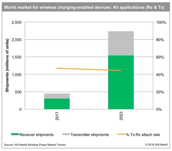 IHS, 2018년부터 2023년까지 무선 충전 수신기 60억대 이상 출하 전망
