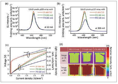 마이크로 LED는 일반적인 대면적 LED와 비교해 불투명한 p-금속전극에 가려지는 면적이 상대적으로 많아 활성층에서 생성된 빛이 외부로 나가지 못하고 내부에서 재흡수되거나 손실이 발생하는 한계가 꾸준히 지적돼왔다. 김 교수 연구팀은 이러한 한계를 이겨내고자 연구를 진행했고, 가시광 영역에서 투과도가 매우 높은 질화알루미늄(AlN) 물질 내부에 인듐(In)과 주석(Sn) 금속 기반의 전류주입 경로를 형성시켜 높은 투과도는 유지한 채 효과적인 전류주입이 가능한 새로운 방식의 투명전극을 구현하는 데 성공한 것이다. 특히 연구팀이 개발한 투명전극이 적용된 마이크로 LED는 기존에 사용돼 온 인듐주석산화물(ITO) 투명전극 기반의 마이크로 LED보다 전류밀도는 13%, 광출력은 5% 향상된 특성을 보였다.