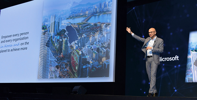 한국마이크로소프트의 ‘퓨처 나우(Future Now)’ AI컨퍼런스에서 키노트 강연을 하고 있는 마이크로소프트 CEO 사티아 나델라(Satya Nadella)