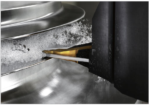 또한 CoroCut 1-2 인서트를 사용한 비선형 공구 경로의 프로파일 가공(플런지 가공 대체)은 칩 컨트롤이 최적화되고 절삭 마모가 균일해지며 가공물 응력이 감소하는 데 직접적인 도움을 준다. 이는 모두 우주 항공 엔진 부품의 가공에서 중요한 요소이다.
