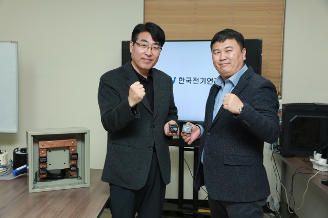 ▲ 한국전기연구원 배준한 책임연구원(왼쪽)과 기술이전 대상 업체 엘시그니처 조쌍규 대표이사가 '전기과열 방지 무전원 무선온도진단 기기'를 들고 포즈를 취하고 있다. <사진 : 한국전기연구원 제공>