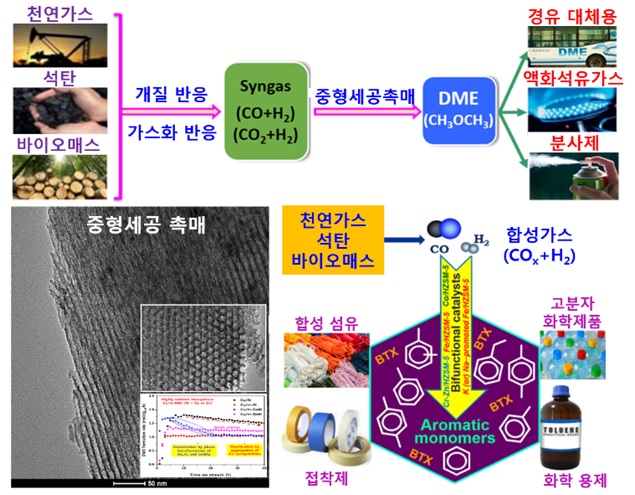 나아가 연구팀은 구조적으로 안정한 중형 세공의 알루미나 및 제올라이트 촉매를 제조해 디메틸에테르로부터 석유화학 기초유분(올레핀, 벤젠, 톨루엔, 자일렌 등)을 합성하는 기술도 개발했다.