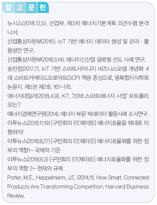 미국과 우리나라에서 모두 에너지 관련 데이터의 수집과 공유, 분석이 가능해지는 가능성이 열리고 있다. 이러한 환경에서 먼저 에너지 소비 효율화 측면에서 AMI가 보급되고 실시간 모니터링을 통해 전력 소비자에게 알람 형식으로 알리는 서비스가 등장했다. 이는 앞에서 언급한 SCP 역량의 첫 번째인 모니터링 단계에 속하며, 데이터 수집이 더욱 활성화되고 공유될 수 있다면 다음 단계로의 비즈니스모델 확장이 가능할 것으로 보인다. 다음 호에서는 모니터링 단계에만 머물지 않고 제어 단계로 확장된 비즈니스모델 사례들을 탐색하고자 한다.