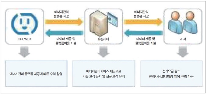 모니터링 서비스 차원에서 오파워는 패턴 분석 알고리즘을 유틸리티 업체에 판매하고, 전력기업인 그림 1의 유틸리티는 고객의 에너지 사용패턴을 분석해서 불필요한 전력 사용 절감을 유도하는 정도의 역할을 하고 있다. [그림1]에서 보듯이, 오파워는 유틸리티 사업자에게 기술을 제공하는 B2B 기업이다. 즉, 오파워는 고객의 전력 사용량 데이터를 활용해 별도 요금제나 부하 제어기기 같은 직접적 방법이 아닌 간접적인 개입을 통해 고객이 자발적으로 부하를 삭감하도록 유도하는 방식의 모니터링 서비스를 제공하고 있는 것이다. 참여 고객은 페이스북 계정을 이용하여 무료로 에너지 절감 관련 소셜 앱을 다운받아 이용하고 있으며, 유틸리티 기업은 고객의 절전 유도를 위하여 정보 제공 및 절전 과제를 직접 운영하고, 고객이 요구하면 고객의 전력사용 정보를 오파워가 운영하는 소셜 앱에 제공하고 있다.