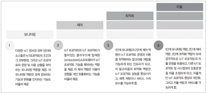 마지막인 자율(Autonomy) 단계에서는 모니터링, 제어, 최적화 역량들이 모여 궁극적으로 IoT 제품의 자율적 운영을 허용하고, 다른 IoT 제품 및 시스템과의 상호 운영을 자율적으로 조정하게 하고, 자율적인 IoT제품 향상과 개인화, 자율 처방과 서비스를 가능하게 한다.