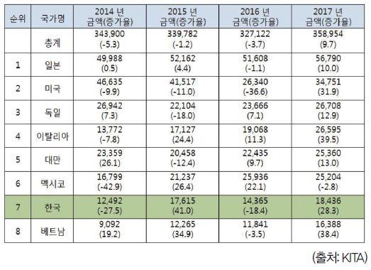 2017년 중국의 RFID 리더기 수입규모는 약 3억6000만 달러로 전년 대비 9.7% 증가했다. 그중 한국은 약 1800만 달러로 전년 대비 28.3% 증가해 수입상대국 7위를 차지했다.