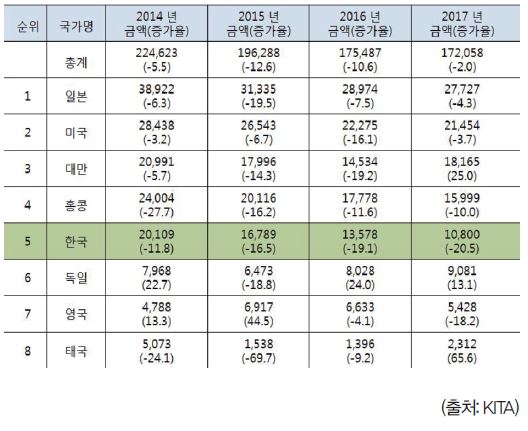 2017년 중국의 RFID 태그 수입규모는 약 1억7206만 달러로 전년 대비 2.0% 감소하는 약간의 하락세를 보였다. 그 중 한국은 약 1080만 달러로 전년 대비 20.5% 감소됐으며 최근 4년간 연속 하락세를 보이고 있다.