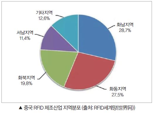 중국 RFID 제조산업은 베이징을 중심으로 환발해만(环渤海湾)지역, 상하이를 중심으로 한 장삼각(长三角)지역 및 광둥성으로 구성돼 있으며 빠른 속도로 성장하고 있는 추세다. 그중 상하이는 칩 생산, 광둥성(주로 선전)은 조립 및 포장, 베이징은 솔루션 개발을 위주로 산업분포를 이루고 있다.