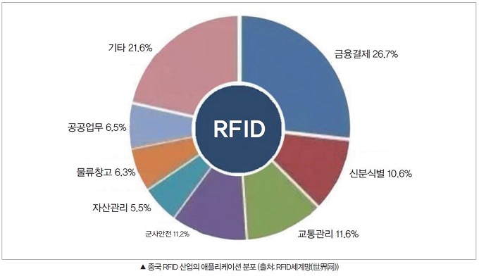 현재 중국은 주로 금융결제(26.7%), 교통관리(11.6%), 군사안전(11.2%), 신분식별(10.6%) 등에 RFID기술을 많이 활용하고 있다.