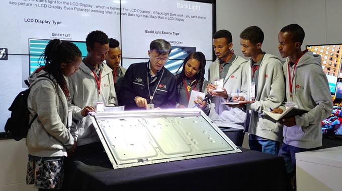 ▲ LG전자가 이달 3일부터 8일까지 에티오피아에 있는 ‘LG-KOICA 희망직업훈련학교’의 우수학생 7명을 두바이에 위치한 중동아프리카서비스법인에 초청해 해외 연수 기회를 제공하고 있다. 7일, 학생들이 서비스법인 관계자로부터 TV의 백라이트유닛(BLU)에 대해 설명을 듣고 있다.