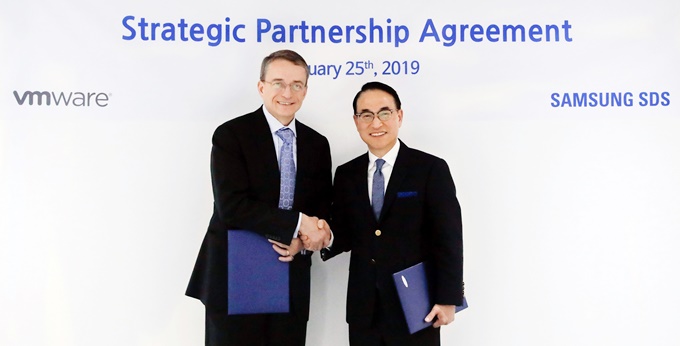 삼성SDS는 미국 VM웨어(VMware)와 MWC 2019 행사 기간 중 양사 CEO가 만나 전략적 제휴를 맺고 디지털 업무환경 혁신 사업을 공동 전개하기로 했다고 26일 밝혔다.