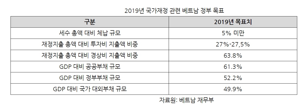 연초, 베트남 정부는 ’19년도 물가 상승률을 4% 이하로 목표 설정했으며, 재정 적자 감소, 주식 시장 안정 등 거시경제 안정화를 위한 위기관리 능력이 향후 중요할 것으로 전망된다.