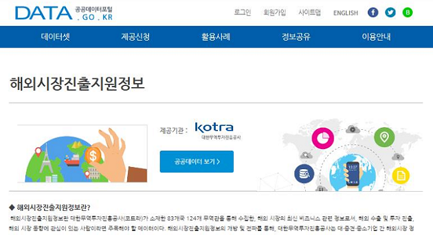 대한무역투자진흥공사(이하 KOTRA)가 해외시장 진출 지원정보 데이터를 공공데이터 포털을 통해 무료로 전면 개방했다. 이번에 개방된 해외시장 진출 지원정보 데이터는 2018년 행정안전부와 한국정보화진흥원이 지원하는 국가중점데이터로 선정, 추진됐다.