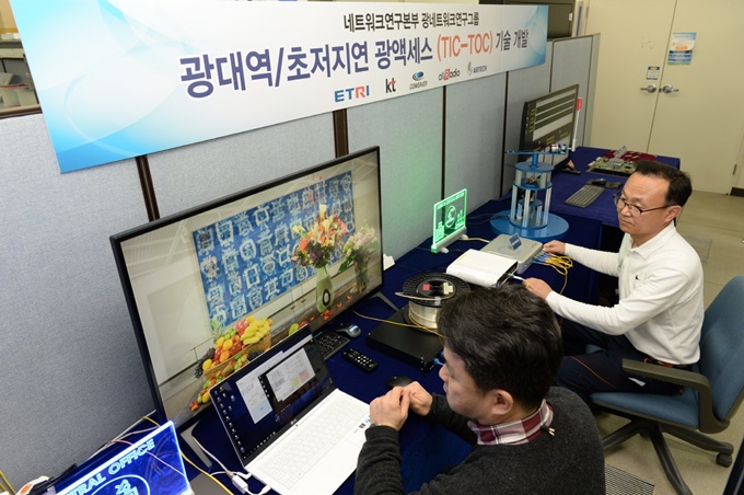 ▲ ETRI 연구진이 광대역 기술 시험을 위해 무압축 동영상 전송을 진행하고 있는 모습이다.