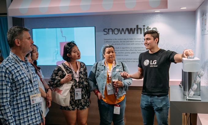 ▲ 관람객들이 캡슐형 아이스크림 제조기 컨셉 제품인 ‘스노우화이트(snowwhite)’를 관람하고 있다. 캡슐형 아이스크림 제조기는 소르베, 젤라또, 프로즌요거트 등 아이스크림 종류를 결정하는 베이스 캡슐, 맛과 향을 결정하는 플레이버(flavor) 캡슐 2가지를 조합해 다양한 아이스크림을 독자적인 냉각기술을 통해 만들 수 있다.
