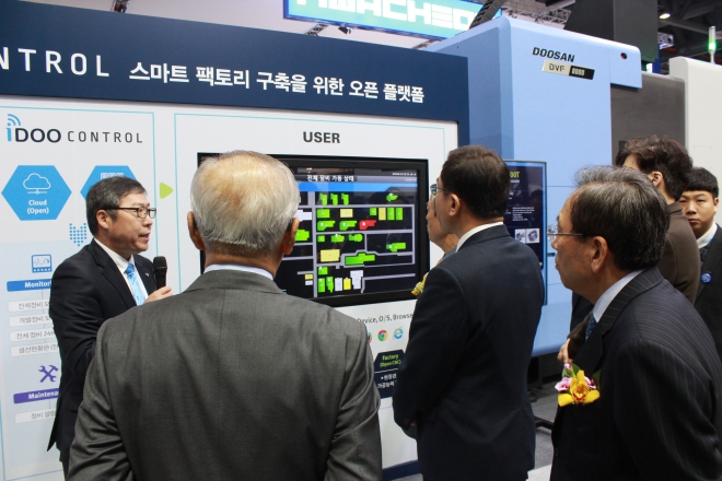 ▲VIP 인사들이 화천기계 부스에서 머시닝센터에 대한 소개를 듣고 있다.