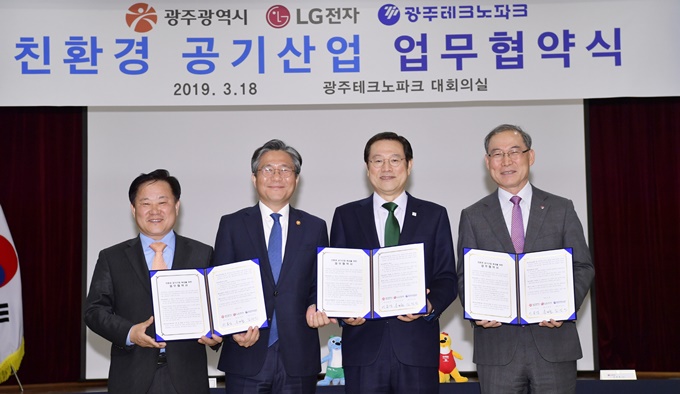 18일, LG전자·광주광역시·광주테크노파크가 광주광역시 북구 대촌동에 있는 광주테크노파크에서 협약을 맺고 공기산업 연구개발, 생산·제조 분야 협력적 생태계 조성, 일자리 창출 등 협력키로 했다.