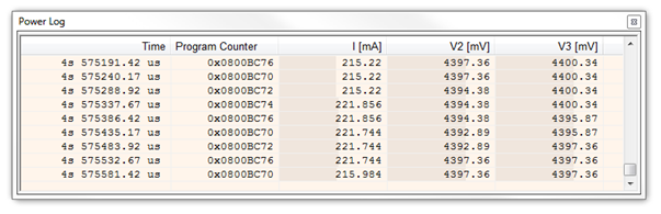 파워 로그(Power Log) 창에서는 응용 프로그램 동작 중 PC(Program Counter), 전류 소비량과 측정 전압을 기록하는 창이다. 측정 전압 값은 아이-스코프(I-scope)를 이용해 전압 측정을 했을 경우만 기록되며 아이-스코프 장비가 연결되지 않은 경우에는 전압을 측정할 수 없다.