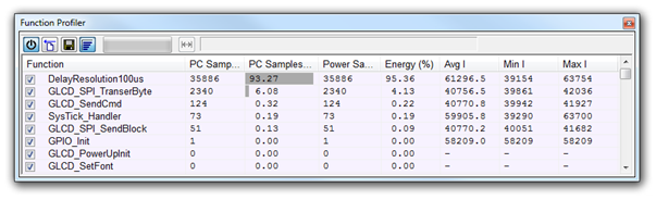 함수의 프로파일링 정보를 확인 할 수 있는 함수 프로파일러(Function Profiler) 창은 응용 프로그램이 실행되는 동안 가장 많이 시간을 소비하고 있는 함수가 어떠한 함수인지 파악하는데 유용하게 사용된다. 이러한 함수 프로파일러 창에 PC(Program Counter) 샘플 카운터 외 전류 소비량의 샘플 데이터 또한 출력할 수 있어사 함수 별 전류 소비율, 최대 전류량, 최소 전류량, 평균 전류량을 확인 할 수 있다.