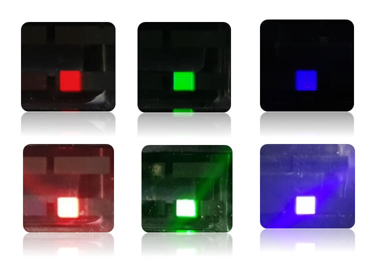 ▲ 동일 전압 조건에서 ETRI 연구진이 치환한 QLED가 기존 QLED보다 더 밝게 발광하고 있는 것을 나타낸 모습.(위쪽 줄이 기존QLED, 아래쪽 줄이 치환된 QLED)
