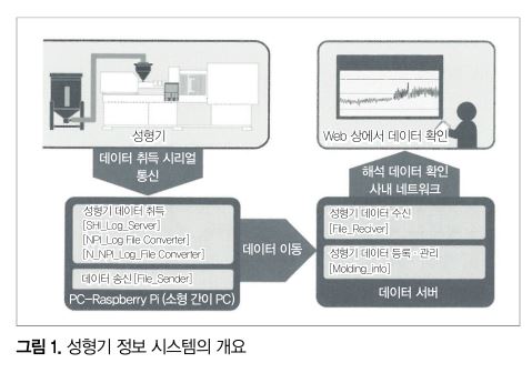 그림 1에 성형기 정보 시스템의 개요를 나타냈다. 이 시스템은 성형기 메이커에 관계없이 성형기에서 성형기 로그 데이터를 실시간으로 반영(5분마다), 네트워크 상에서 각 데이터의 그래프화된 것을 확인할 수 있다.