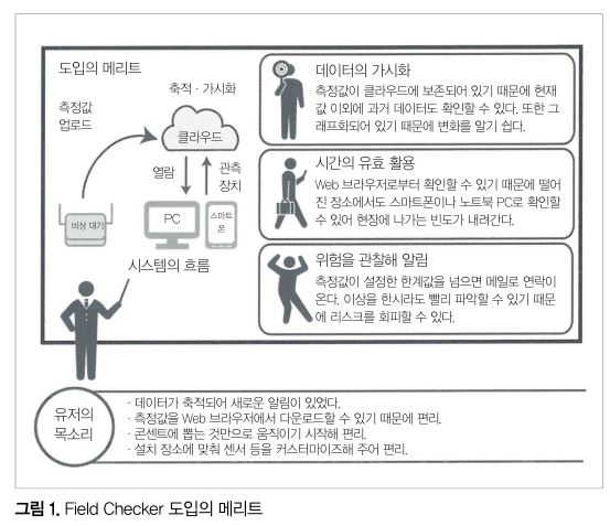 'Field Checker'는 동사와 미츠이(三井)공동건설컨설턴트(주)가 공동으로 제공하는 IoT 서비스의 총칭이다. 콘셉트는 ‘언제라도, 어디에서나, 누구라도’ 이용할 수 있는 IoT로, 간단한 환경 관측을 체험함으로써 IoT를 조금이라도 이해하고 유저와 함께 만들어 가는 시스템을 기본으로 하고 있다. 그림 1에 Field Checker 도입의 메리트를 나타냈다.
