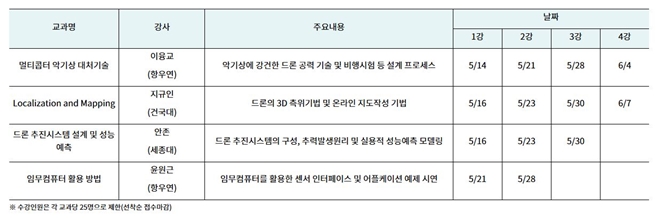 기업관계자, 창업준비자 등은 누구라도 참여가능하며, 참가신청은 5월 2일(목) 10시부터 5월 10일(금) 18시까지 무인이동체사업단 홈페이지를 통해 선착순으로 진행된다.