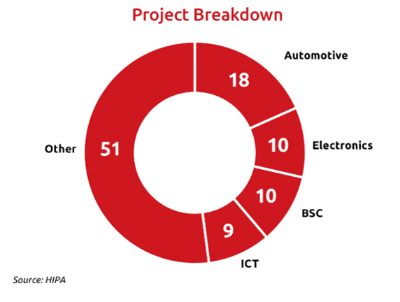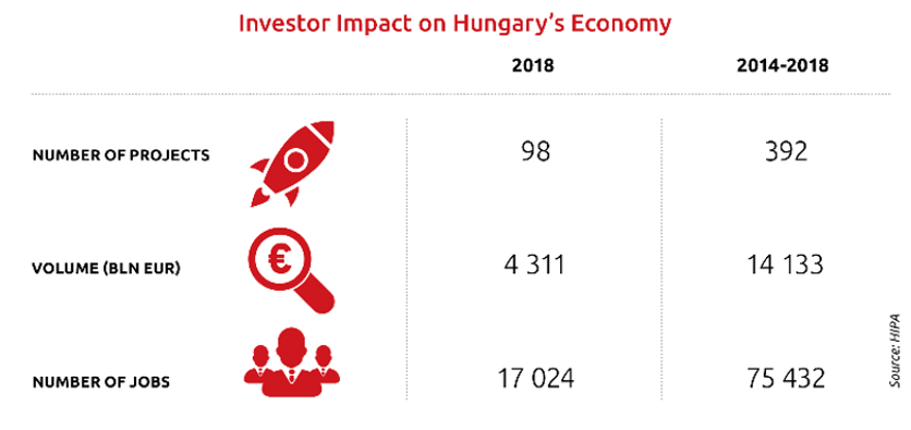 헝가리 투자청(HIPA)에 따르면 2018년 헝가리의 투자유치 성과는 프로젝트 98건, 투자 금액 43억 유로(전년대비 23% 증가)를 기록함. 향후 본 프로젝트로 인해 1만 7024개 일자리 창출이 예상된다. 2018년 전 세계적으로 국가별 투자유치 경쟁이 치열했음에도 불구하고 헝가리 투자유치 성과는 질적, 양적으로 전년대비 우수한 성장세를 보이고 있다.