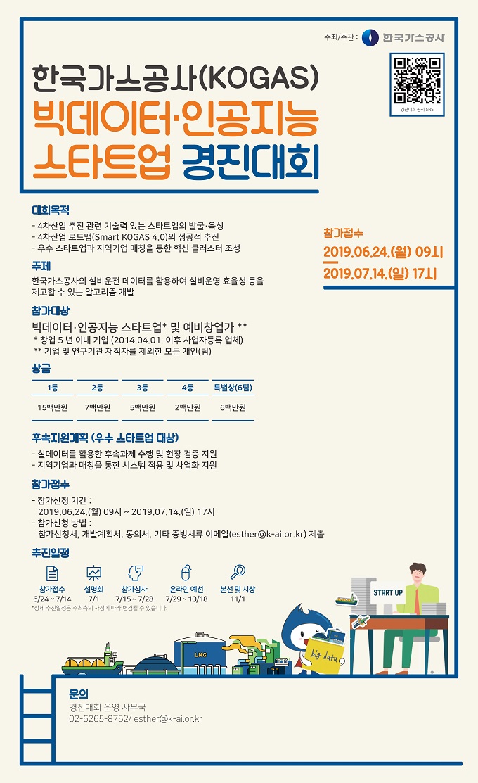 한국가스공사(이하 가스공사)는 우수 스타트업을 발굴‧육성하기 위해 축적된 설비운전 데이터를 활용하여 ‘빅데이터‧인공지능 스타트업 경진대회’를 개최한고 24일 밝혔다.