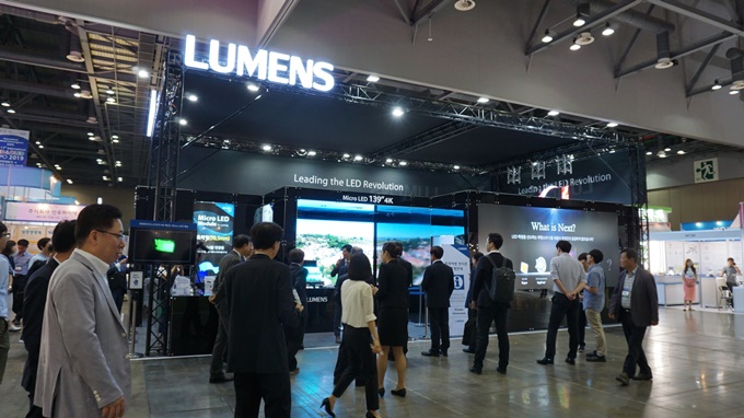 루멘스가 일산 킨텍스 제1전시장에서 개최 중인 광유합엑스포 2019에서 ‘Leading the LED Revolution (LED 혁명 선도)’를 주제로 마이크로 LED 139인치 4K를 소개했다. 또한 초박형의 마이크로 LED 모듈(T0.5mm)도 볼 수 있다.