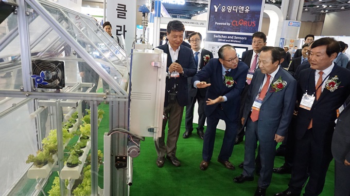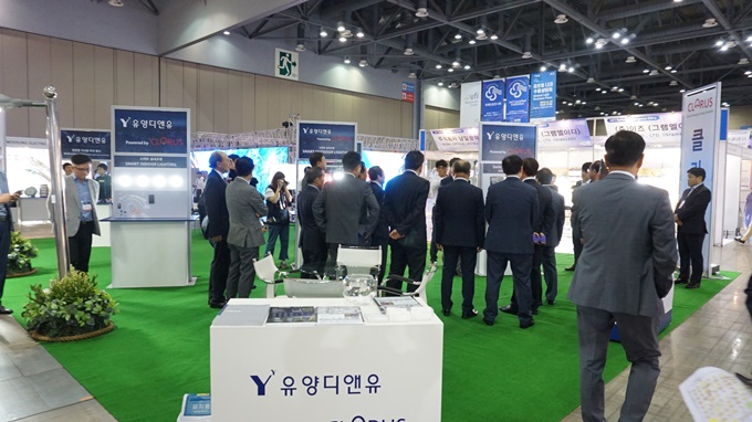 유양디앤유가 일산 킨텍스 제1전시장에서 개최 중인 광유합엑스포 2019에서 실시간 모니터링을 통해 식물 성장을 위한 최적 환경이 유지되도록 구현한 데모를 선보였다. 특히 이 스마트팜은 유‧무선 네트워크를 통해 스마트폰이나 PC로 확인 및 유지관리가 가능하다.