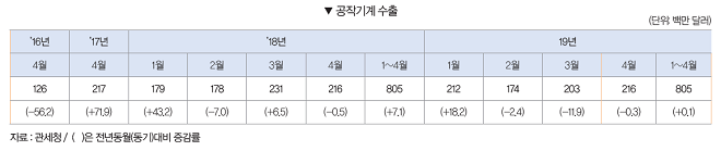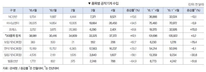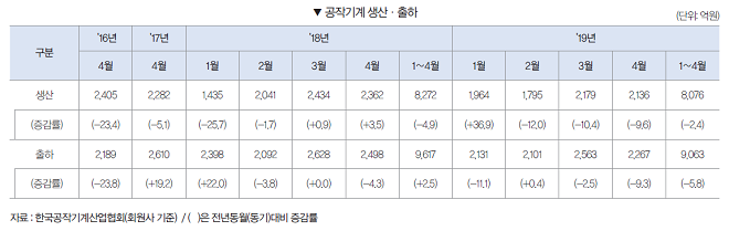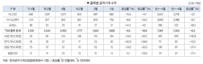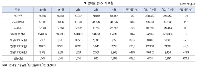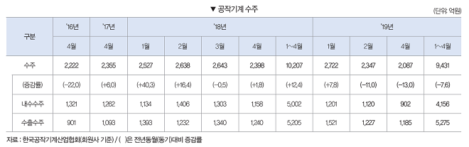 한국의 4월 수주량은 3월에 이어 연속 감소세를 보였다. 반면 생산과 출하, 수출과 수입은 모두 증가세를 보였다. 4월 공작기계 시장 성적은 미중 무역분쟁 해결 지연 등의 대외 환경 및 내수 제조업 설비투자 감소 등에 따른 경기 악화의 영향을 받았다. 특히 내수수주는 10년 만에 처음으로 1,000억원 이하 기록이 3월부터 이어지고 있다.