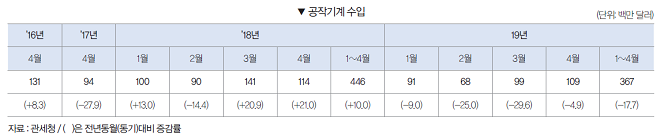 2019년 4월 공작기계 수입은 1억900만 달러로 전월대비 9.5% 증가했다. 전년동월과 대비해서는 4.9% 감소했다.