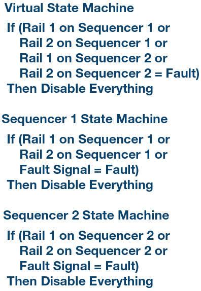 예컨대 시퀀서 1로 2개의 전압 레일을, 시퀀서 2로 2개의 전압 레일을 각각 모니터링한다고 하자. 설계에 따르면 4개의 전압 레일 중 하나라도 고장을 발견하면 모든 것이 정지된다. 여기서는 디바이스가 2개이므로, 이들 사이에 결함 신호를 공유해야 한다. 그림 4는 이 시스템의 가상 상태기와 개별 디바이스 상태기를 나타낸다.