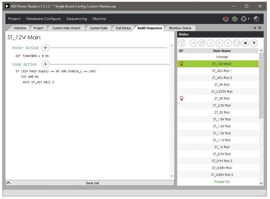 레일 수가 늘어나고 시퀀싱 요구가 복잡해질수록, 시스템의 가상 상태기와 디바이스 차원 상태기의 차이는 점점 더 벌어진다. 설계자는 어떻게 동작이 일어났으면 하고 생각하는 것이 있을 것이고, 그러기 위해서는 시퀀서들을 잘 조율해야 한다. 여기에는 많은 시간이 걸리고 버그도 발생하기 쉽다. ADI Power Studio는 상태기 작성 작업의 상당 부분을 자동화한다. 사용자가 GUI를 사용해서 설계하면, 여러 시퀀서들 사이의 복잡한 통신은 ADI Power Studio의 컴파일러가 알아서 처리한다. 따라서 설계자는 유연하면서도 직관적인 방법으로 복잡한 상태기를 생성할 수 있다.