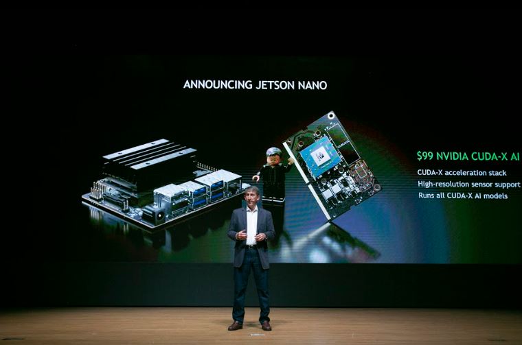 ▲ 마크 해밀턴 부사장이 소형 AI 컴퓨터 젯슨 나노에 대해 설명하고 있다