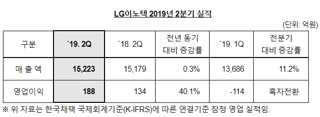 LG이노텍은 2019년 2분기에 한국채택 국제회계기준(K-IFRS)으로 매출 1조5,223억원, 영업이익 188억원을 기록했다고 23일 공시했다. 전년 동기 대비 매출은 0.3%, 영업이익은 40.1% 증가했다. 전분기 대비 매출은 11.2% 증가하고 영업이익은 흑자전환했다.