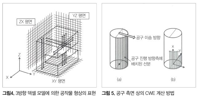 이번에 실장한 CWE 계산 소프트웨어는 공작물의 형상 표현으로서 3방향 덱셀 모델을 이용하고 있다. XY 평면 상에 조밀한 정사각형 격자를 배치, 각 격자점에서 Z방향으로 늘어나는 선분군으로 입체 형상을 표현하는 방법을 덱셀 모델이라고 부른다.