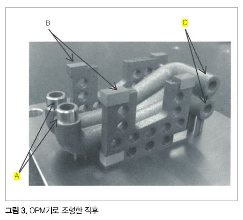 이것에 대해 그림 3은 OPM기를 사용해 복합가공한 조형 직후의 상태이다. 2차가공을 고려해 서포트를 붙여 조형하고 있으며, OPM기의 경우에는 기기 상에서 가급적 다듬질해 둘 수 있어 2차가공의 부담을 최소한으로 억제할 수 있다.