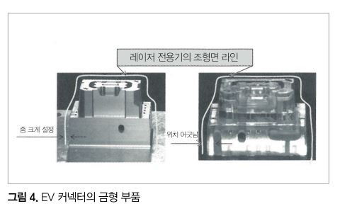 금속 3D 프린터로 적층조형된 사출성형용 금형은 내부의 3차원 수관을 최적으로 배치함으로써 성형품의 품질이나 성형 시 냉각 시간의 대폭 단축에 기여하는 것은 여러 문헌에서 소개되어 있다. 여기에서는 그림 4에 나타낸 EV 커넥터의 금형 부품을 예로 들어, 레이저 전용기와 OPM기 및 LPM325로 비교하기로 한다.