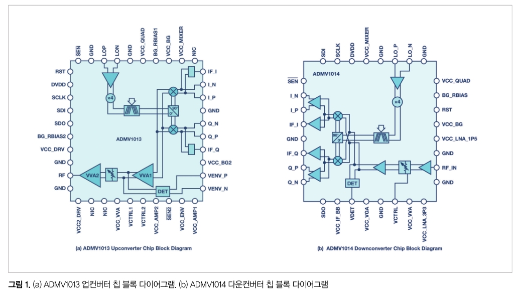 업컨버터 RF 출력은 전압 가변 감쇠기(voltage variable attenuator, VVA)가 있는 온칩 송신 드라이버 증폭기를 포함하며, 다운컨버터의 RF 입력은 저잡음 증폭기( low noise amplifier, LNA)와 이득단 및 VVA를 포함한다. 두 칩의 국부 발진기(local oscillator, LO) 체인은 통합된 LO 버퍼, 주파수 4체배기, 그리고 프로그래밍 가능한 대역 통과 필터로 구성된다. 대부분의 프로그래밍과 보정 기능은 SPI 인터페이스를 통해 제어되므로 이들 IC를 소프트웨 어를 이용해 전례 없는 성능 수준으로 손쉽게 구성할 수 있다.