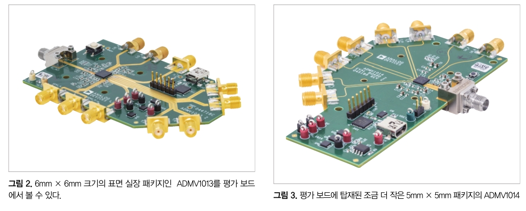 ADMV1013 및 ADMV1014의 성능 특성은 백홀과 프런 트홀로 널리 사용되는 28GHz와 39GHz 대역을 포괄하는 소형 5G 밀리미터파(mmW) 플랫폼 및 다른 많은 초광대 역폭 송신기 및 수신기 애플리케이션을 손쉽게 설계 및 구현할 수 있게 한다.
