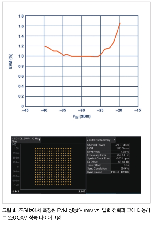 그림 4는 채널당 –20dBm 입력 전력에서 256 QAM으로 변조된 4개의 독립된 100MHz 채널에 대해 5G NR 파형을 사용하여 28GHz 주파수에서 측정한 다운컨버터의 성능을 보여준다.