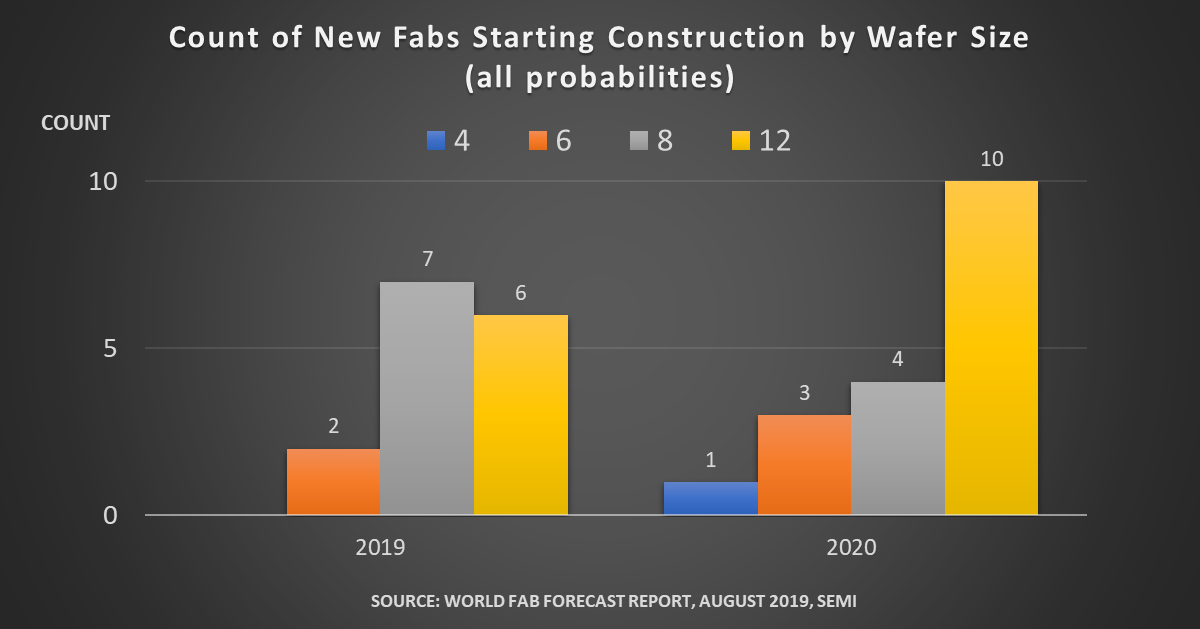 또한 "2019년에 건설이 시작되는 팹의 대부분은 2020년 상반기에 장비 도입이 진행되어 일부는 2020년 중반부터 생산을 시작할 것으로 보인다. 이 팹들이 생산하는 웨이퍼를 200mm로 환산하였을 경우 한달에 약 74만개의 웨이퍼를 생산할 것으로 예상되며, 대부분은 파운드리(37%), 메모리(24%), MPU(17%)에 쓰일 것으로 전망된다. 2019년에 건설 투자가 진행되는 15개의 팹들 중 7개는 200mm 웨이퍼를 생산한다."고 기술하고 있다.