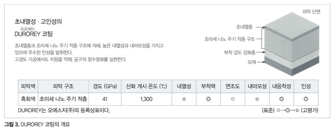 이 AM용 공구는 깊은 절입에도 견딜 수 있는 강인한 3차원 네거티브 형상이 특징이고, 코팅에는 최신 DUROREY 코팅(그림 3)을 채용했다. 기존의 고경도용 코팅에 대해, 높은 내열성과 내마모성, 우수한 인성을 겸비한 코팅으로, 절삭값 변화가 큰 가공에 대해서도 장수명화를 실현했다.